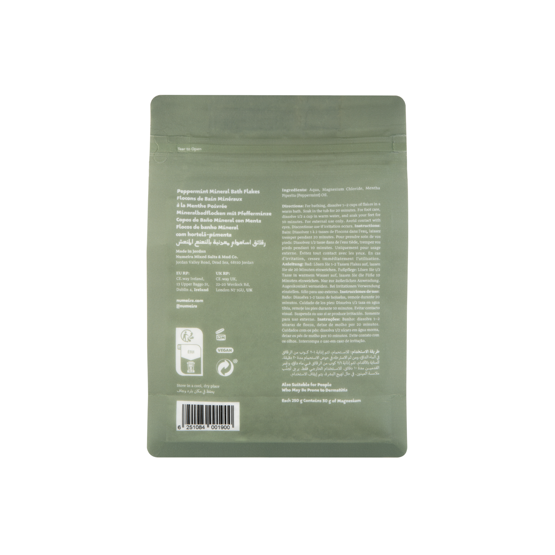 Diese sonnengetrockneten und magnesiumhaltigen Badeflocken werden aus der Sole des Toten Meeres gewonnen. Dieses natürliche Salz ist mit Pfefferminze angereichert, lindert Hautreizungen und spendet Feuchtigkeit. Lösen Sie es in warmem Wasser auf und lassen Sie Ihren Körper die beruhigenden Mineralien aufnehmen.